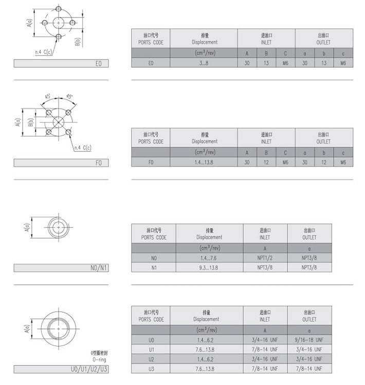| 排量 | 最大壓力 | 最高轉速 | 最低轉速 | 重量 | 尺寸 | 油口代碼 Oi?port?code | 進油口 | 出油口 | ||||||||||