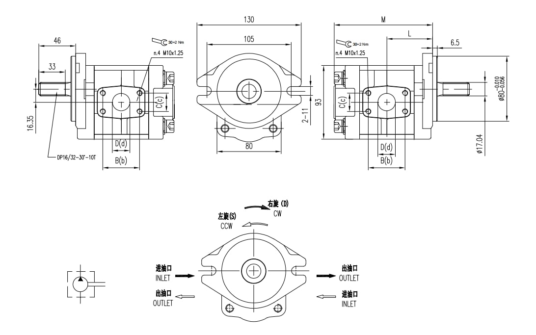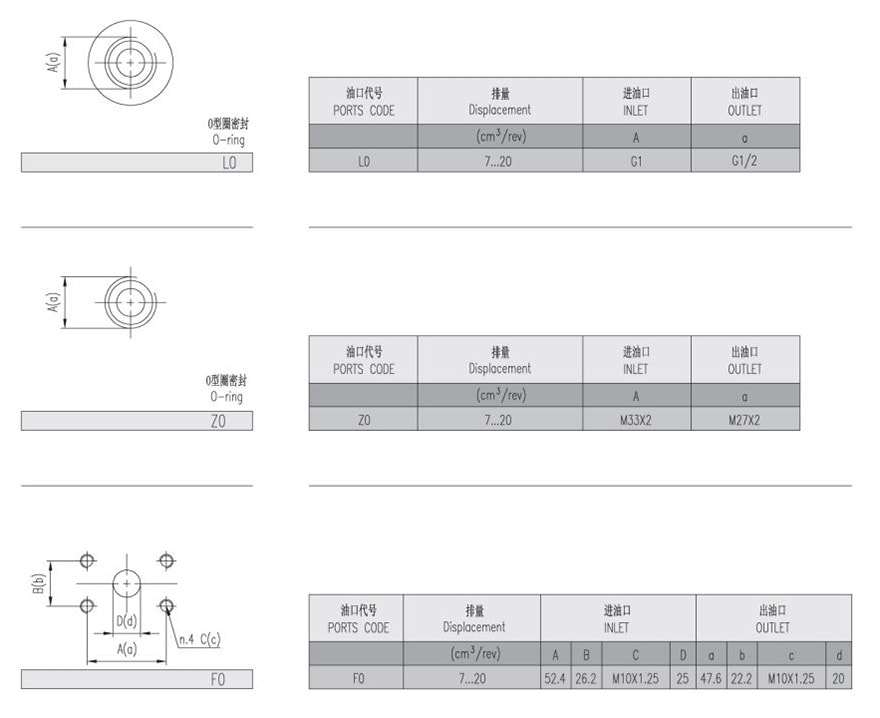 | 排量 | 最大壓力 | 最高轉速 | 最低轉速 | 重量 | 尺寸 | 油口代碼 | 進油口 | 出油口 | |||