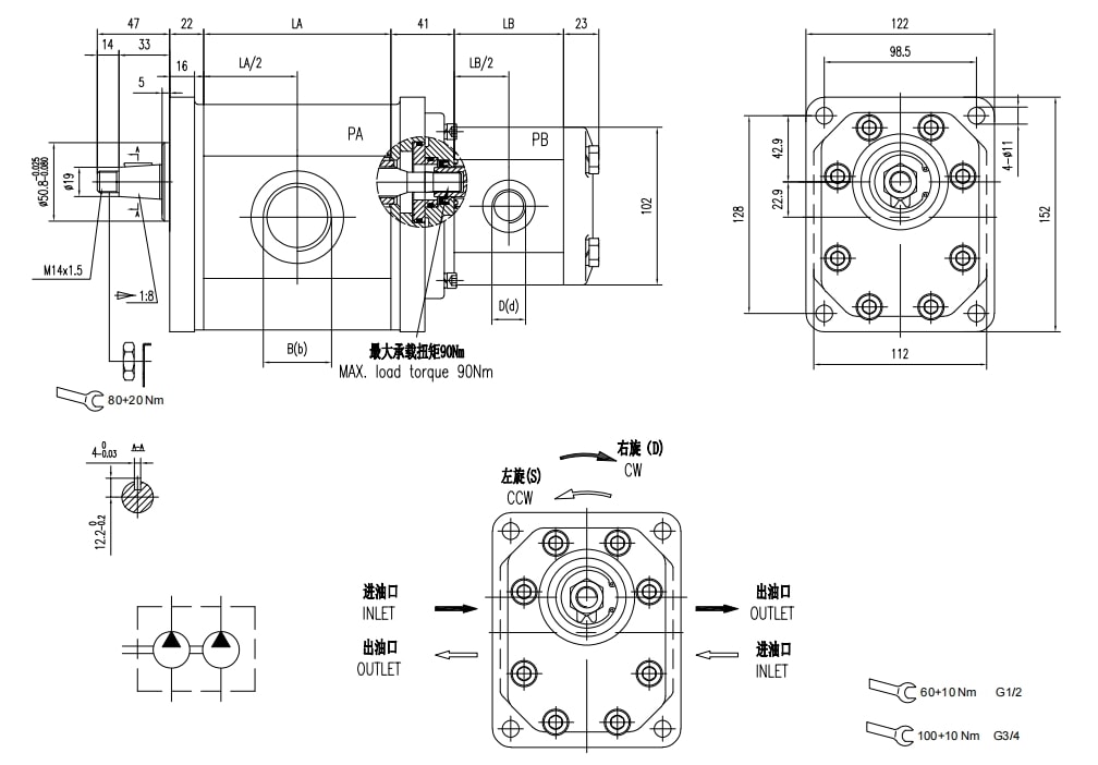 | 排量 | 最大壓力 | 最高轉(zhuǎn)速 | 最低轉(zhuǎn)速 | 尺寸 | 油口代碼 | 進油口 | 出油口 | 油口代碼 | 進油口 | 出油口 | |||